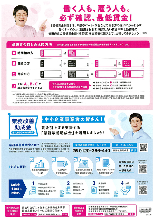 🆕福岡県の最低賃金が改定されました 令和7年11月16日から福岡県の最低賃金が1,057円となりました。 最低賃金とは、働くすべての人に賃金の最低額を保障する制度のことです! 年齢やパート・学生アルバイトなどの働き方の違いにかかわらず、 すべての労働者に適用されます。 使用者も、労働者も、必ず確認!最低賃金! 資料ダウンロード 飯塚法人ニュース Vol.70 🆕田川法人会「新春特別講演会」のご案内 お知らせ お知らせ一覧 飯塚法人ニュース Vol.63 新年号 飯塚法人ニュース Vol.64 清涼号 飯塚法人ニュース Vol.65 新春号 館内小中学校図書館と公立図書館へ税金の学習本を贈呈 福岡県・県税事務所からのお知らせ 飯塚法人ニュース Vol.66 清涼号 飯塚法人ニュース Vol.67 新春号 飯塚法人ニュース Vol.68 清涼号 女性部会長就任あいさつ 青年部会長就任あいさつ